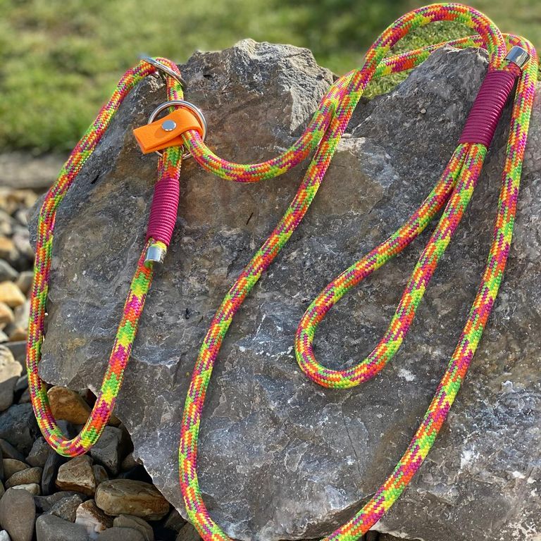aus 10mm starkem Tau, mit rosa Betakelung, orangem Biothanestopp und silbernem Ring, Zugstopp und Endkappen.