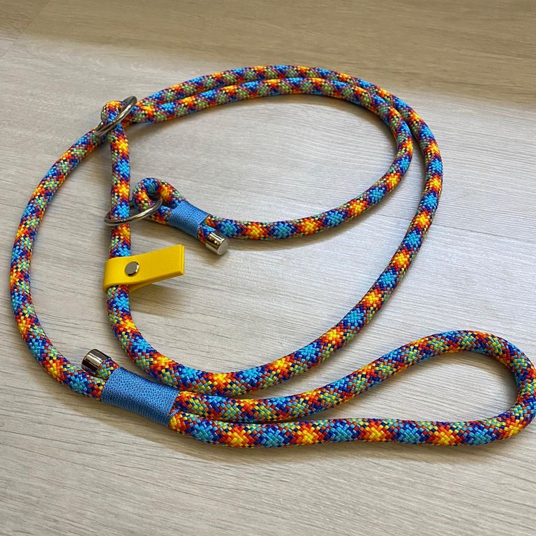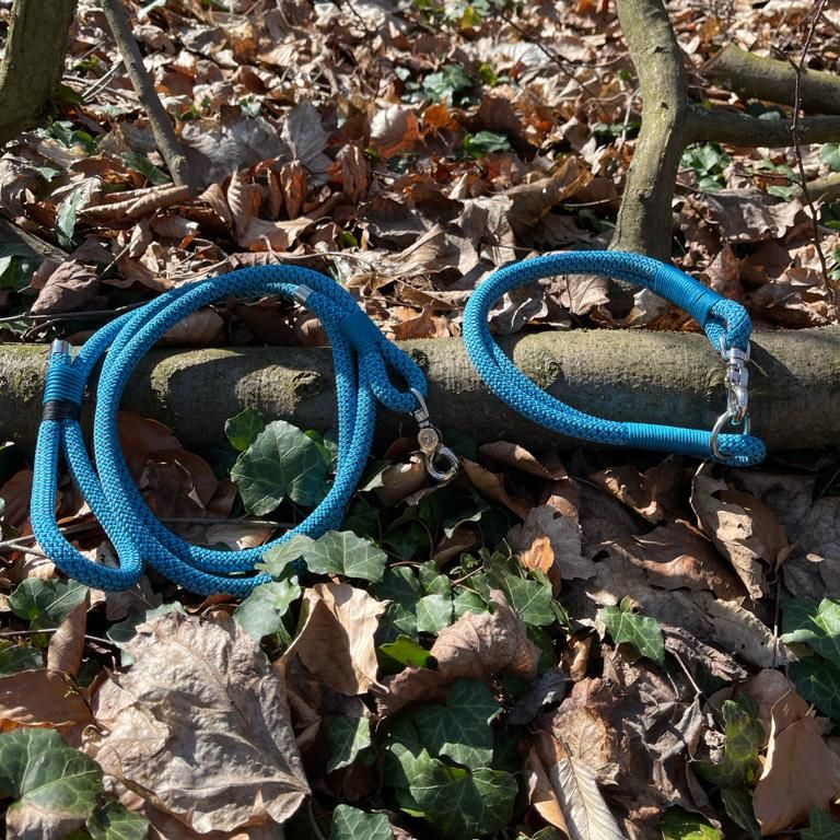 aus 10mm starkem Tau, mit blauer Betakelung und silbernem Ring und Karabinern. Führleine mit Halsband in XL. Das Halsband kann auf Wunsch gekürzt werden. Blau gemustert.