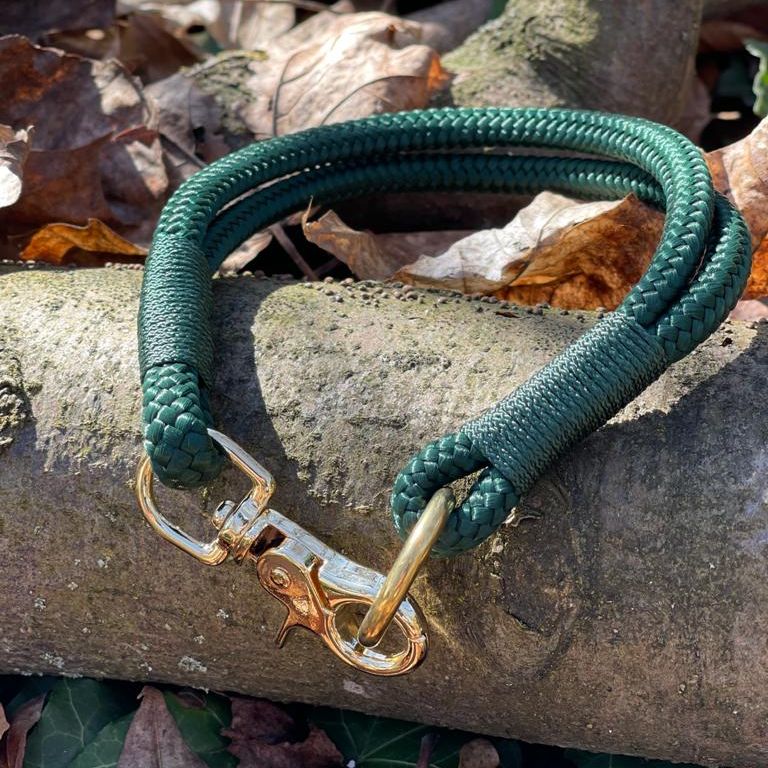 aus 8mm starkem Tau, mit grüner Betakelung und goldenem Karabiner und Ring.